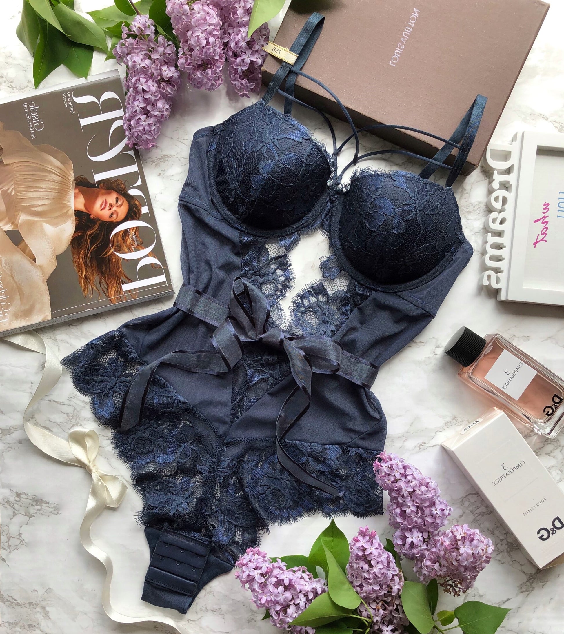 Luksusowe body push-up z koronką i ozdobnymi paseczkami – Niebieski