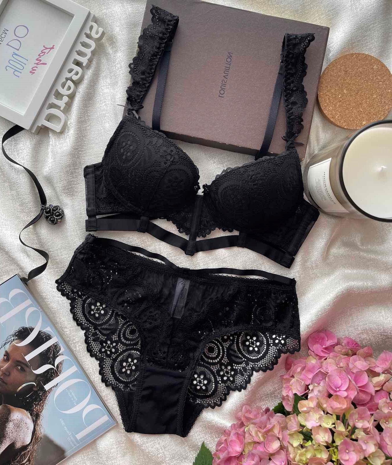 • Figi: koronkowy przód z dekoracyjnymi paseczkami w talii, elastyczna siateczka i gładka tylna część — komfort i niewidoczność pod ubraniem.