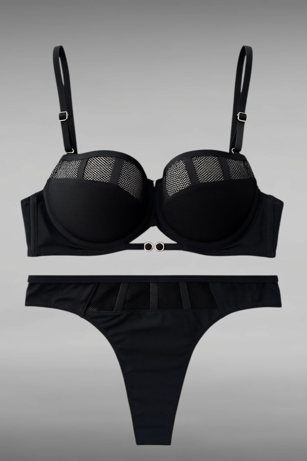 Subtelny, wyrafinowany komplet w odcieniu pudrowego różu. Miseczki na fiszbinach z efektem push-up płynnie przechodzą w lekkie panele z ażurowej siateczki nad linią biustu. Przód zdobią złote kółeczka i satynowe paseczki, które porządkują linię i dodają projektowi eleganckiego charakteru. Figi o nowoczesnym kroju mają wysmuklający panel z siateczki i trzy dekoracyjne przeszycia – to detal, który pięknie akcentuje talię oraz wydłuża nogi.
