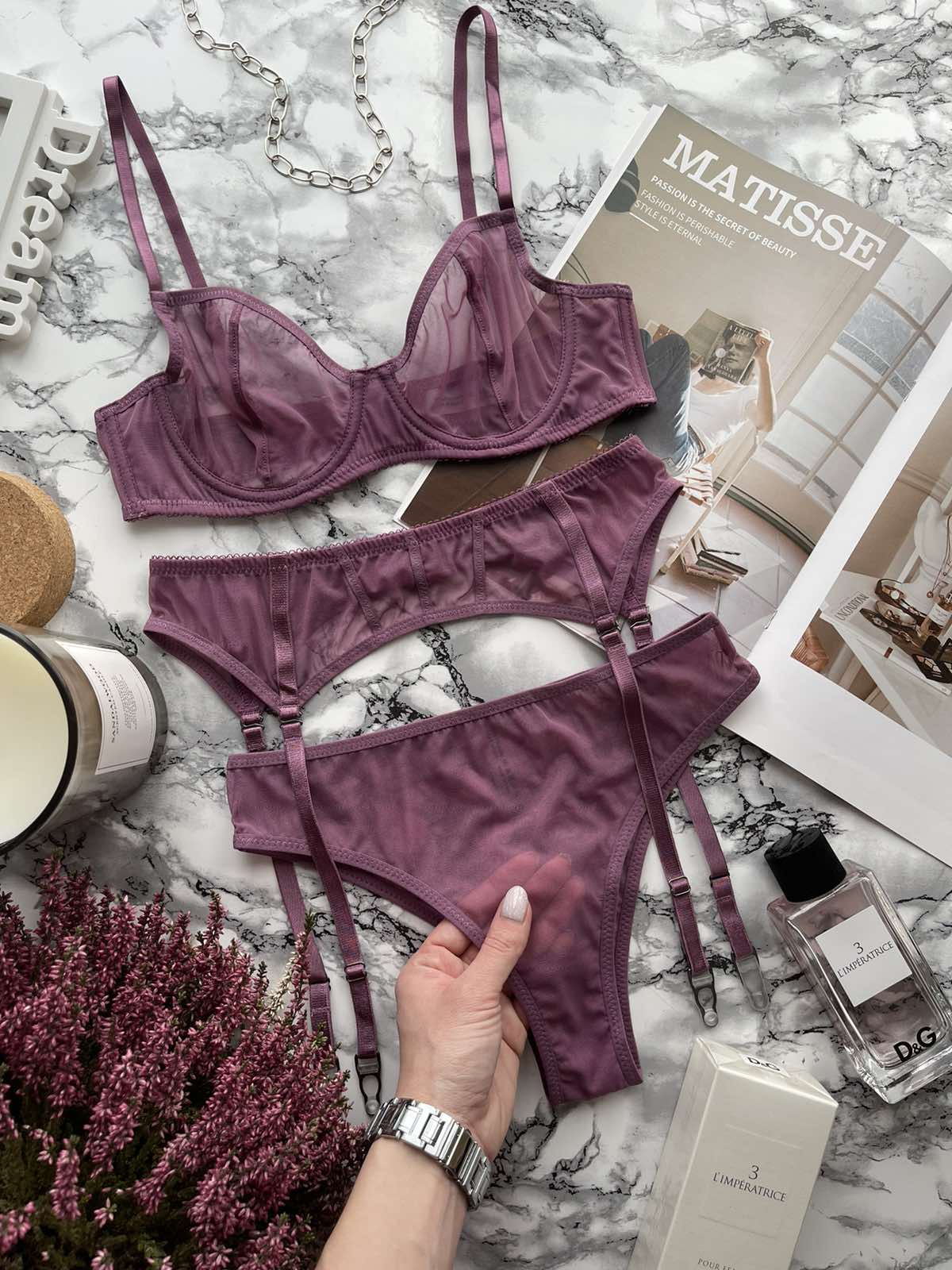 Komplet bielizny 3w1 z siateczki – biustonosz, figi i pasek Fioletowy