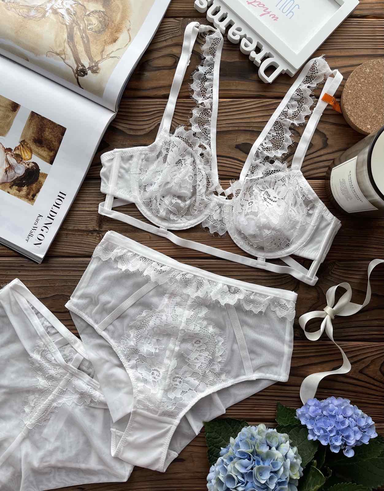 Luksusowy biały komplet bielizny z koronką i wysokim stanem