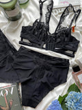 Ten komplet bielizny łączy w sobie kobiecą subtelność i nowoczesny szyk. Wykonany z delikatnej koronki i przezroczystej siateczki, zapewnia zarówno elegancki wygląd, jak i komfort noszenia. Biustonosz z fiszbinami pięknie eksponuje dekolt i podkreśla kształt biustu, a ozdobne paseczki w dekolcie dodają zmysłowego charakteru.