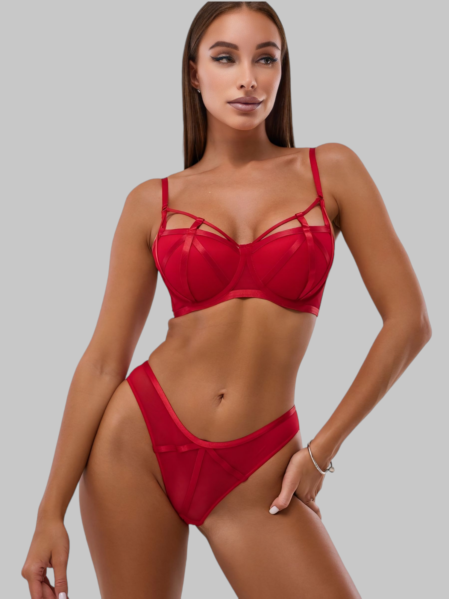 Komplet, który łączy nowoczesny design z perfekcyjnym dopasowaniem. Miseczki biustonosza otulają lekka siateczka, a krzyżujące paski rysują elegancką linię dekoltu. Figi z dopracowanym cięciem w kształcie litery „V” i dyskretnymi przeszyciami dopełniają całości, nadając zestawowi charakteru premium.
