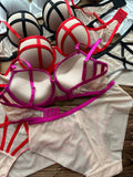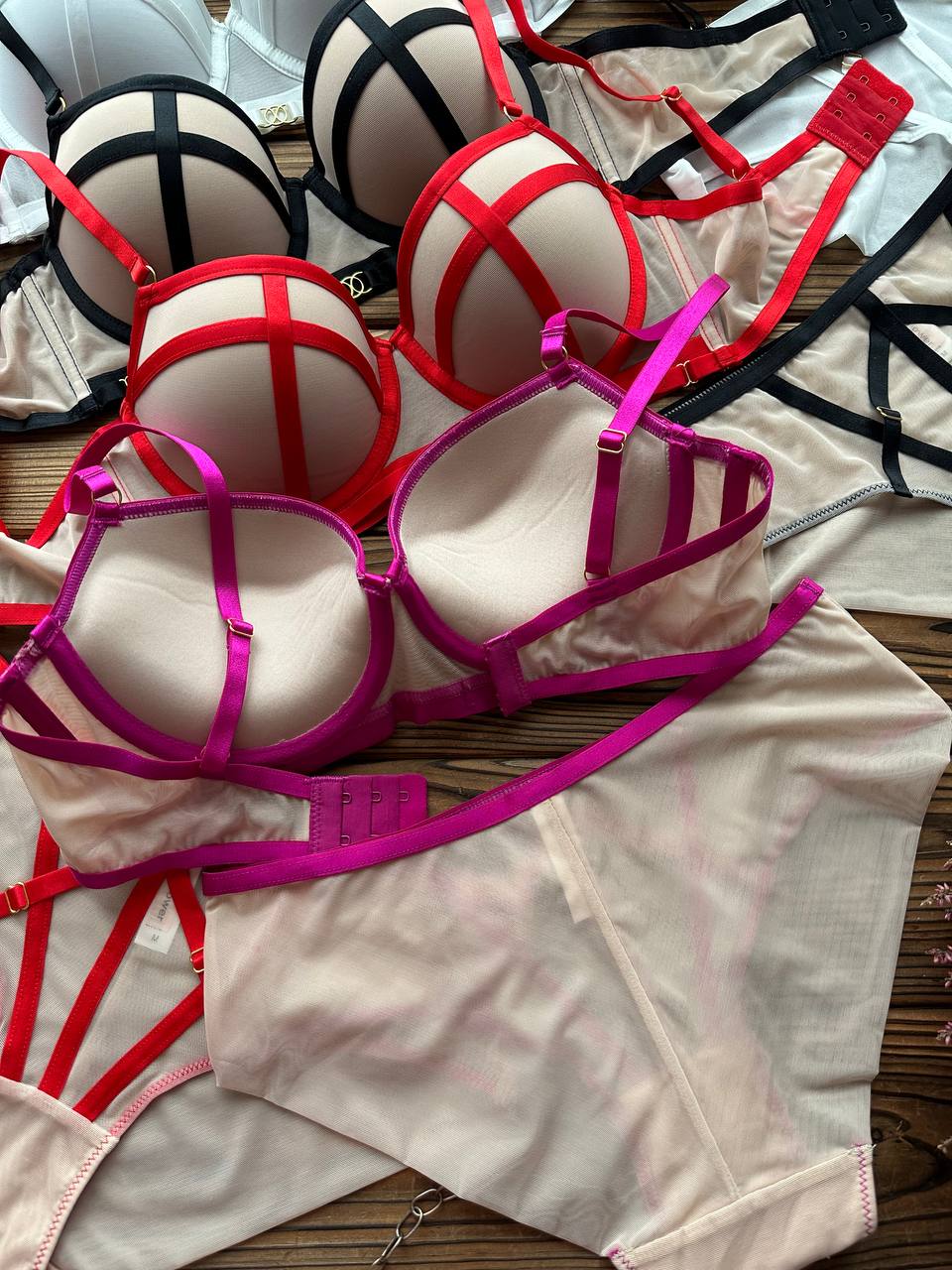 - Biustonosz push-up z siateczką i ozdobnymi paskami.