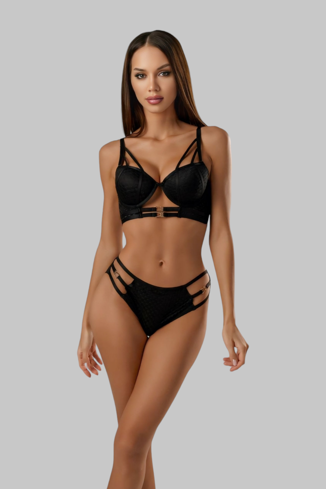 Odkryj komplet, który łączy szlachetną czerwień z dopracowanymi detalami. Uszyty z miękkiej, elastycznej siateczki o fakturze mikro-kwadratów zapewnia lekkość i wygodę, a jednocześnie prezentuje się niezwykle elegancko. Miseczki push-up na fiszbinach porządkują linię biustu, ponad nimi biegną krzyżujące się paski w stylu biżuteryjnym. Pod biustem uwagę przyciąga podwójna, złota klamra. Figi z gładkimi lamówkami mają po bokach podwójne paseczki oraz panel z tej samej teksturowanej siateczki – całość wygląda nowocześnie i klasy premium.