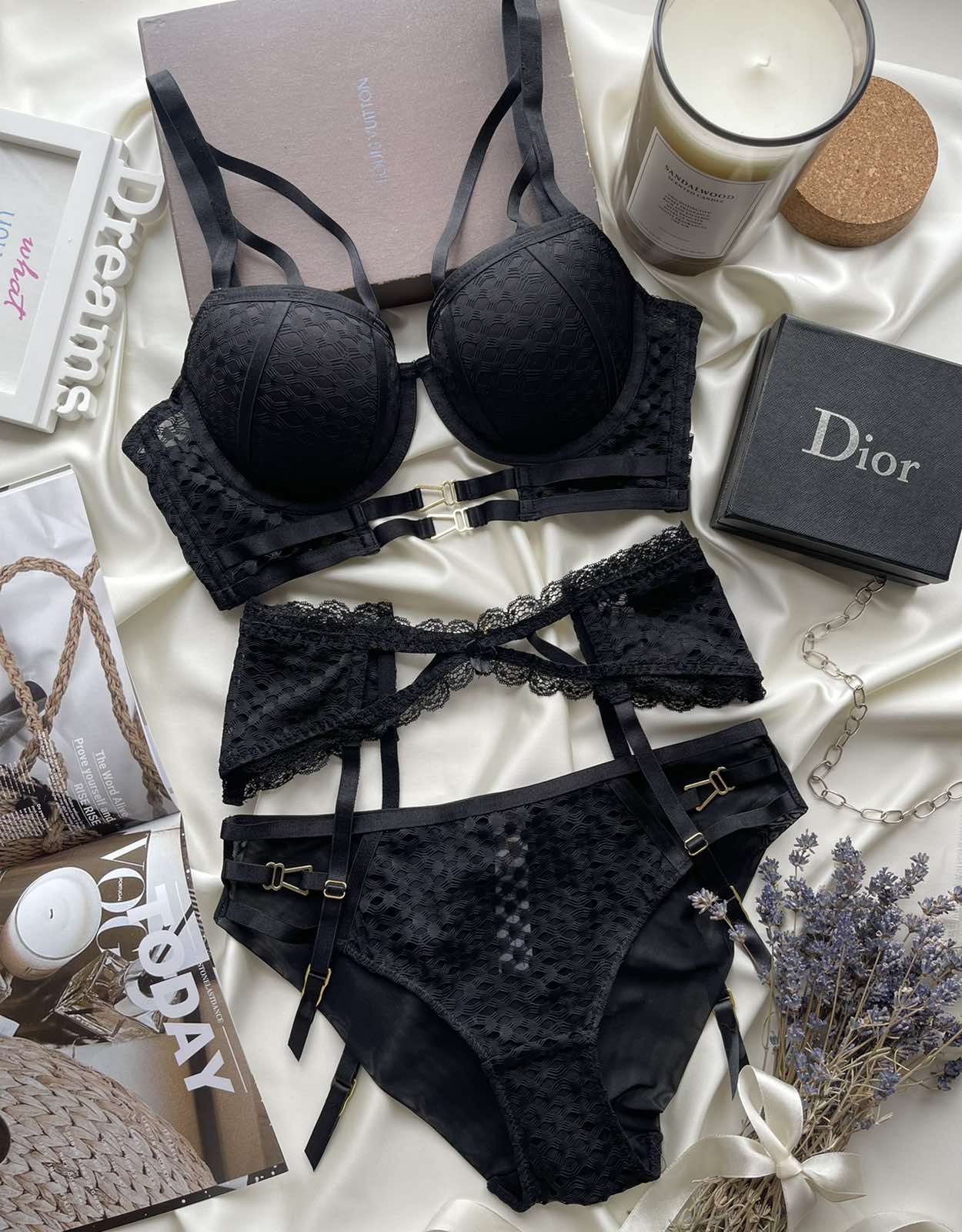Co wchodzi w skład zestawu? W komplecie są biustonosz push-up i figi. Pasek do pończoch nie jest częścią zestawu.